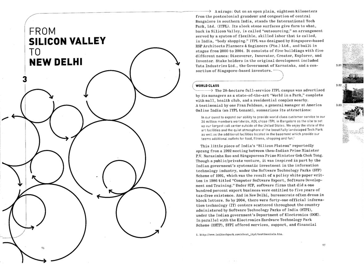 A guidebook to architecture’s future that follows three urban and historical itineraries: Silicon Valley in Northern California; New York’s internal suburbias; and Gurgaon, a burgeoning corporate city out-side of New Delhi. Like so many, these cities are caught within the feedback loops of the Information Age, which makes them important nodes in a single Multi-National City stretching across the globe.With interconnected stories, this book tours the architectural monuments of corporate globalization past and present.
