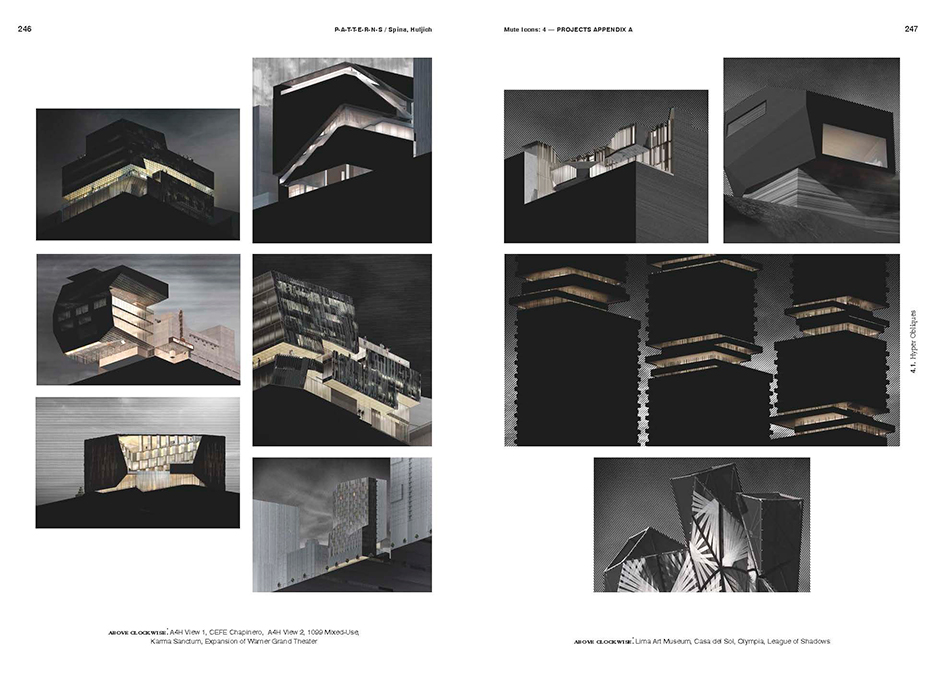 No longer concerned with narrative excesses or with the “shock and awe” of sensation making; the mute icon becomes intriguing in its deceptive indifference towards context, perplexing in its unmitigated apathy towards the body. Object and building, absolute and unstable, anticipated and strange, manifest and withdrawn, such is the dichotomy of mute icons. Dwelling in the paradox between silence and sign and aiming to debunk a false dichotomy between critical discourse, a pursuit of formal novelty and the attainment of social ethics, ‘Mute Icons & Other Dichotomies of the Real in Architecture’ reaffirms the cultural need and socio-political relevance of the architectural image, suggesting a much-needed resolution to the present but incorrect antagonism between formal innovation, social responsibility and economic austerity. Intersecting relevant historical antecedents and polemic theoretical speculations with original design concepts and provocative representations of PATTERNS’s recent work, the book aspires to stimulate authentic speculations on the real.