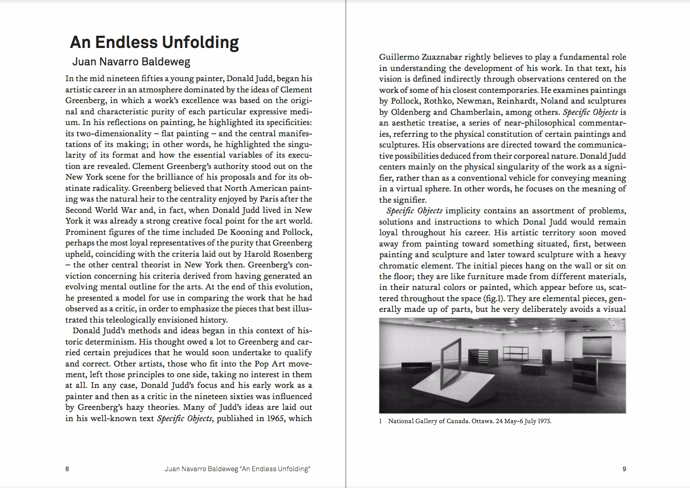 | excerpt | In this brilliant essay, Gillermo Zuaznabar sets out to describe Donald Judd as if he were an unknown figure, a great pioneer. |